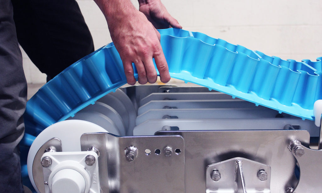 KleanTrak conveyors from UniTrak are cleated belt conveyors specifically engineered to overcome the challenges of sanitary conveying. These conveyors are designed to allow easy cleaning in food, pharmaceutical, and other washdown environments. KleanTrak sanitary belt conveyors can operate at any angle to up to 75°.